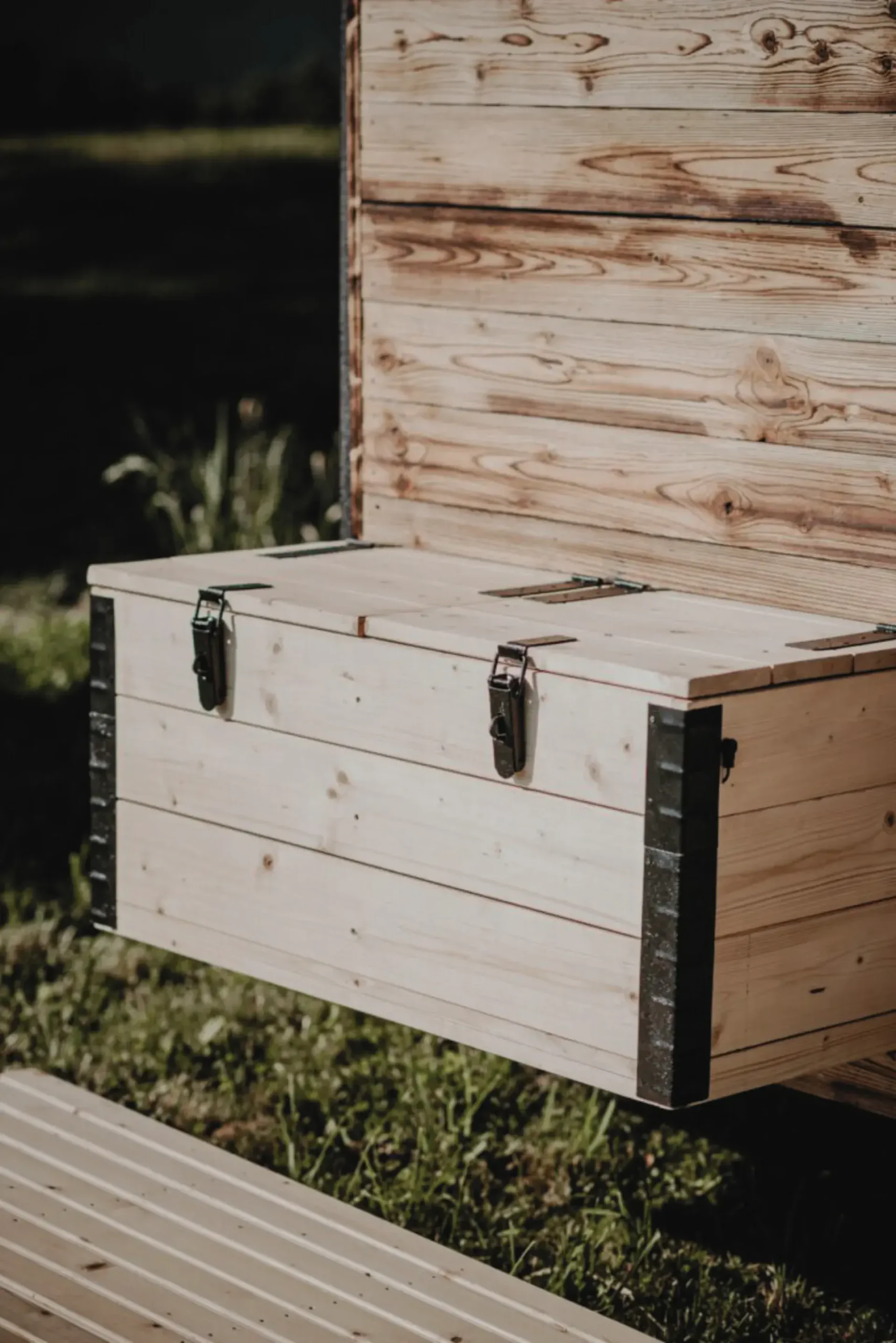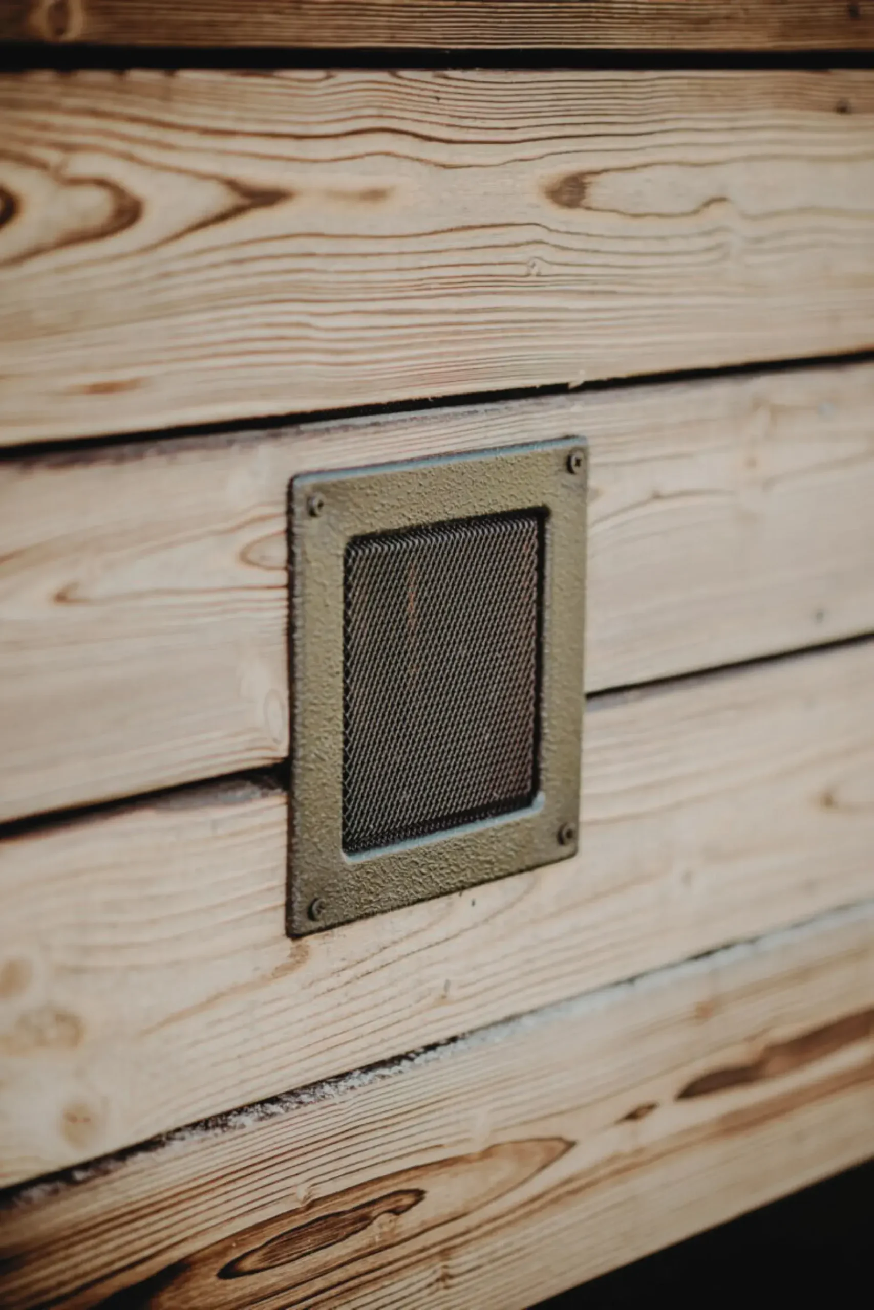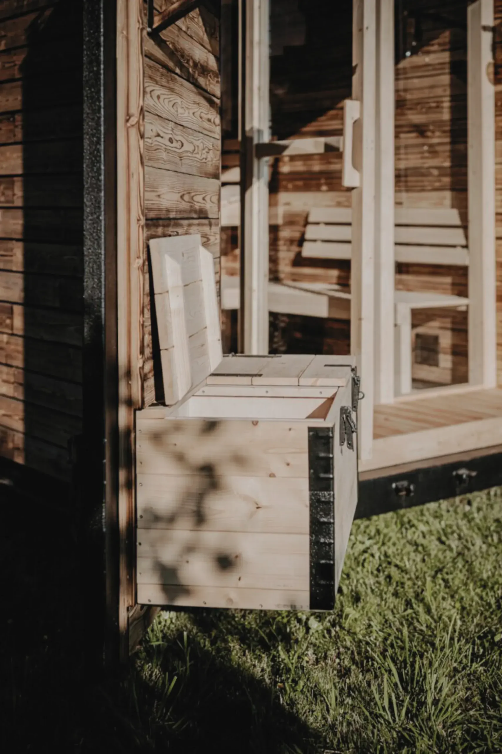 Die Sauna ist außen mit 21 mm dicken Fichtenbrettern verkleidet