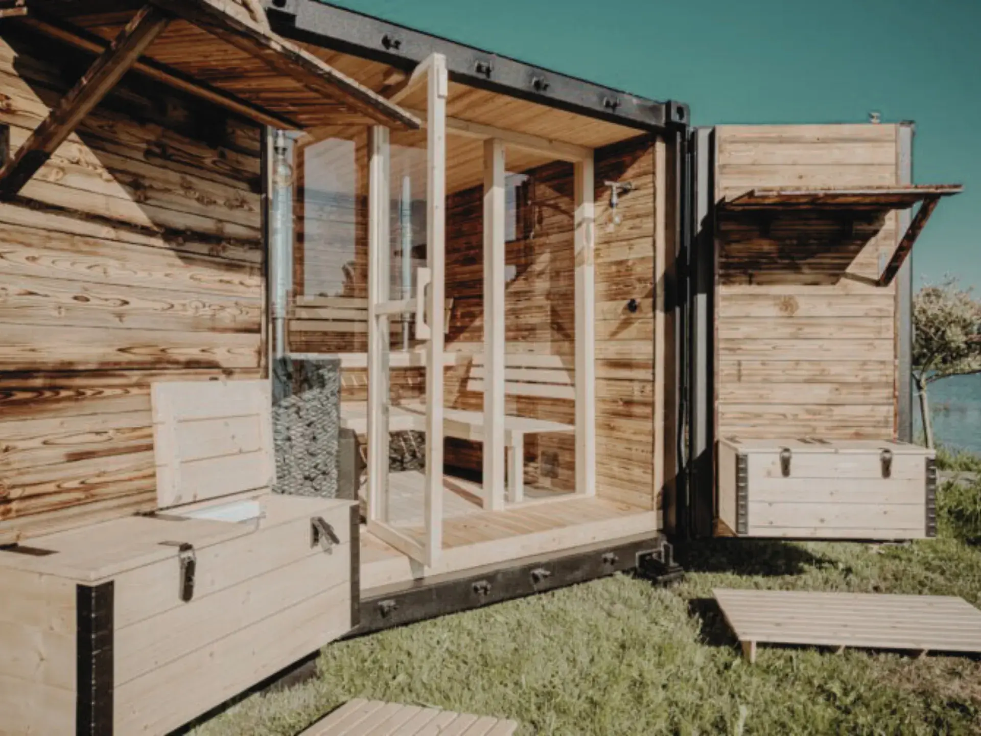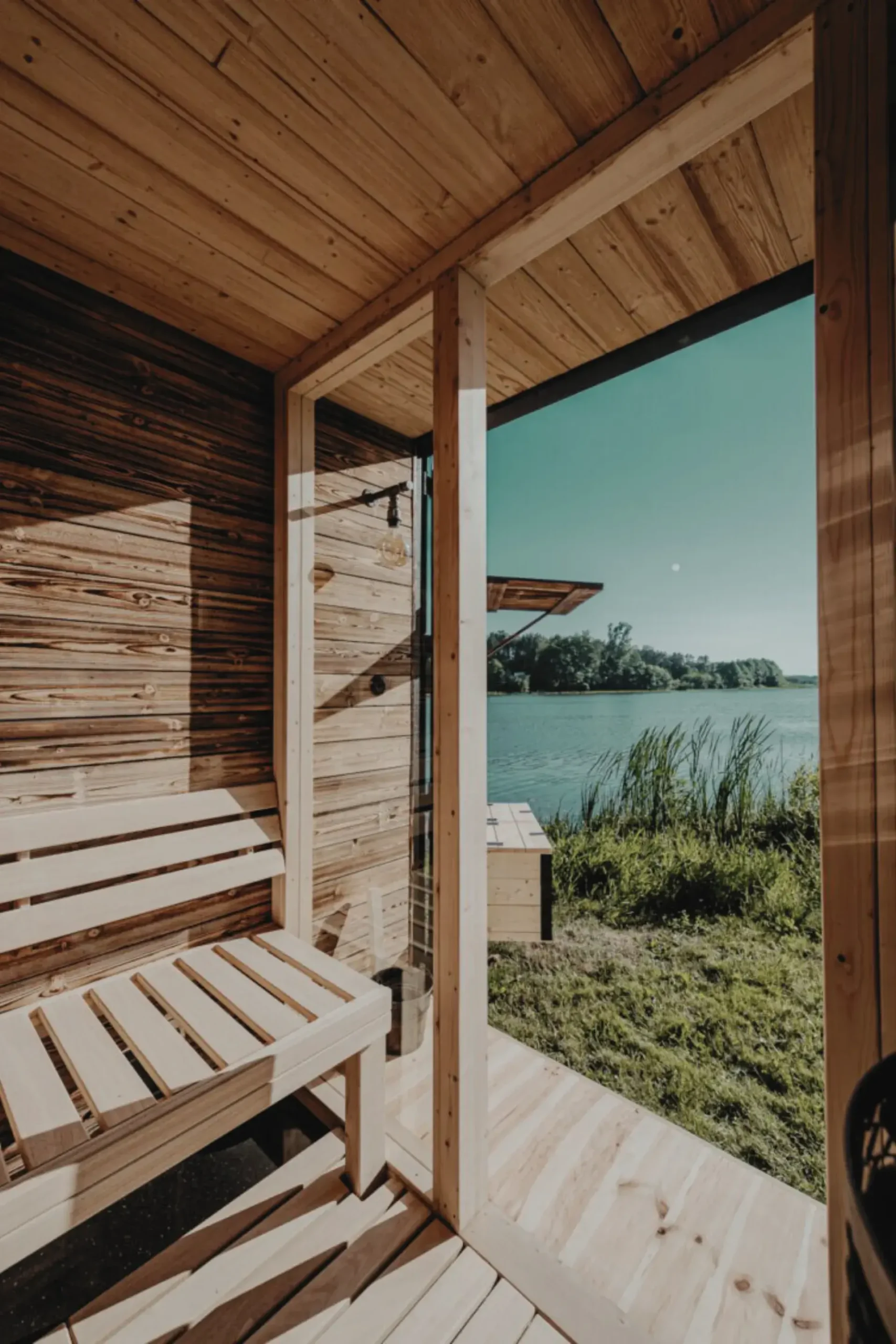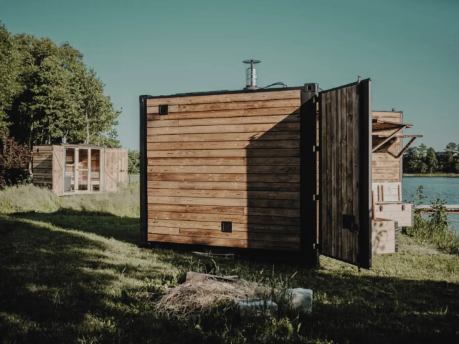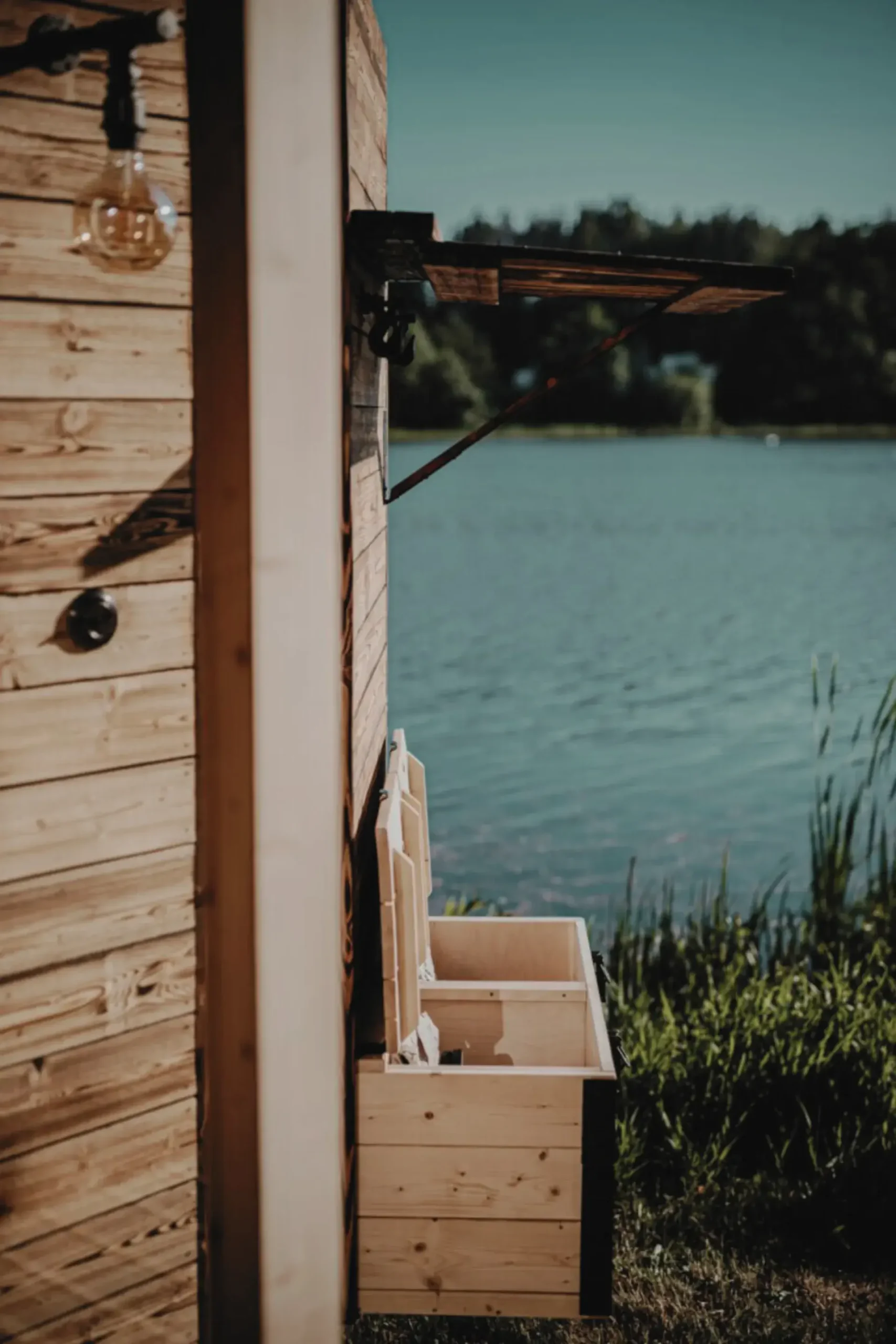 Die Sauna ist außen mit 21 mm dicken Fichtenbrettern verkleidet