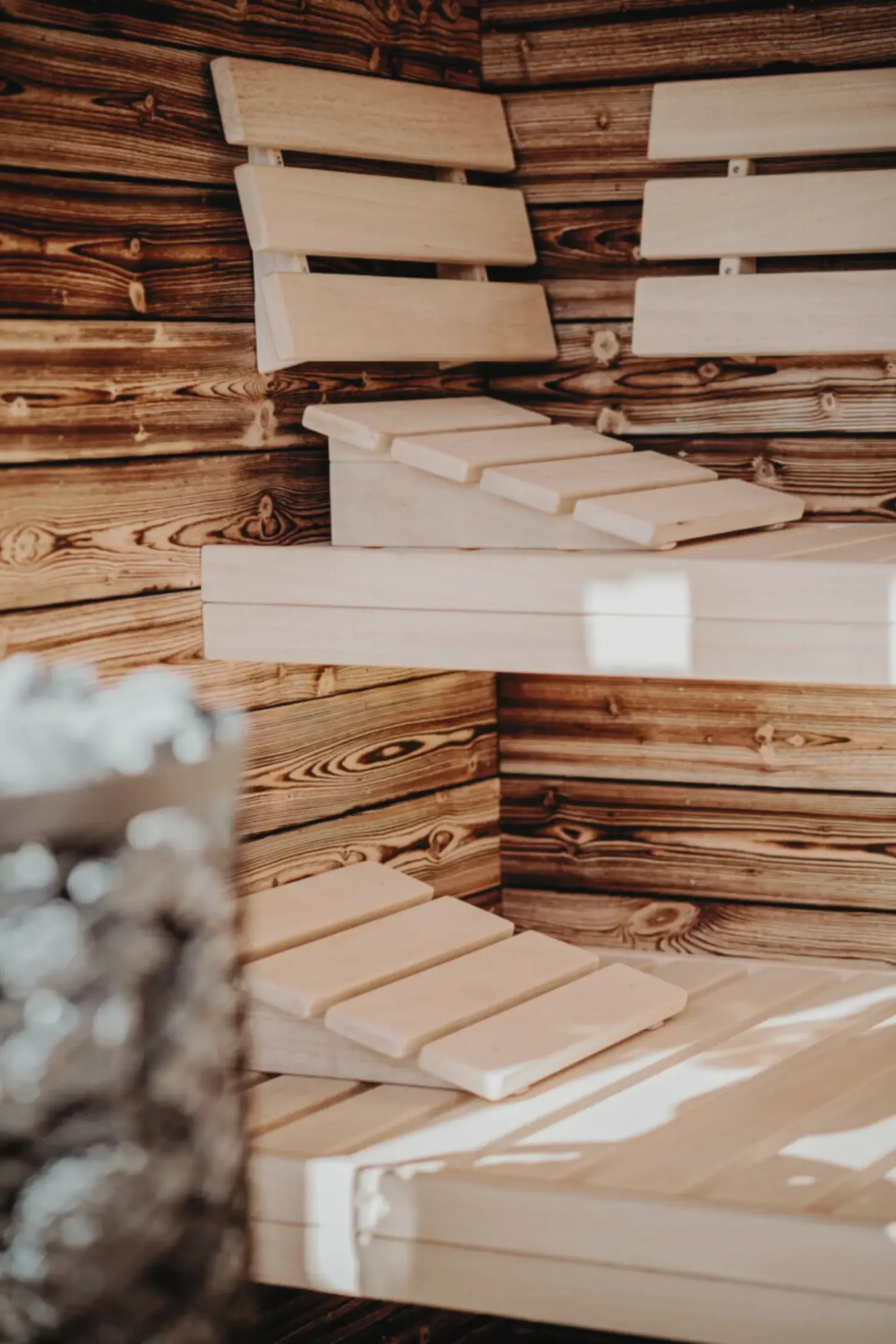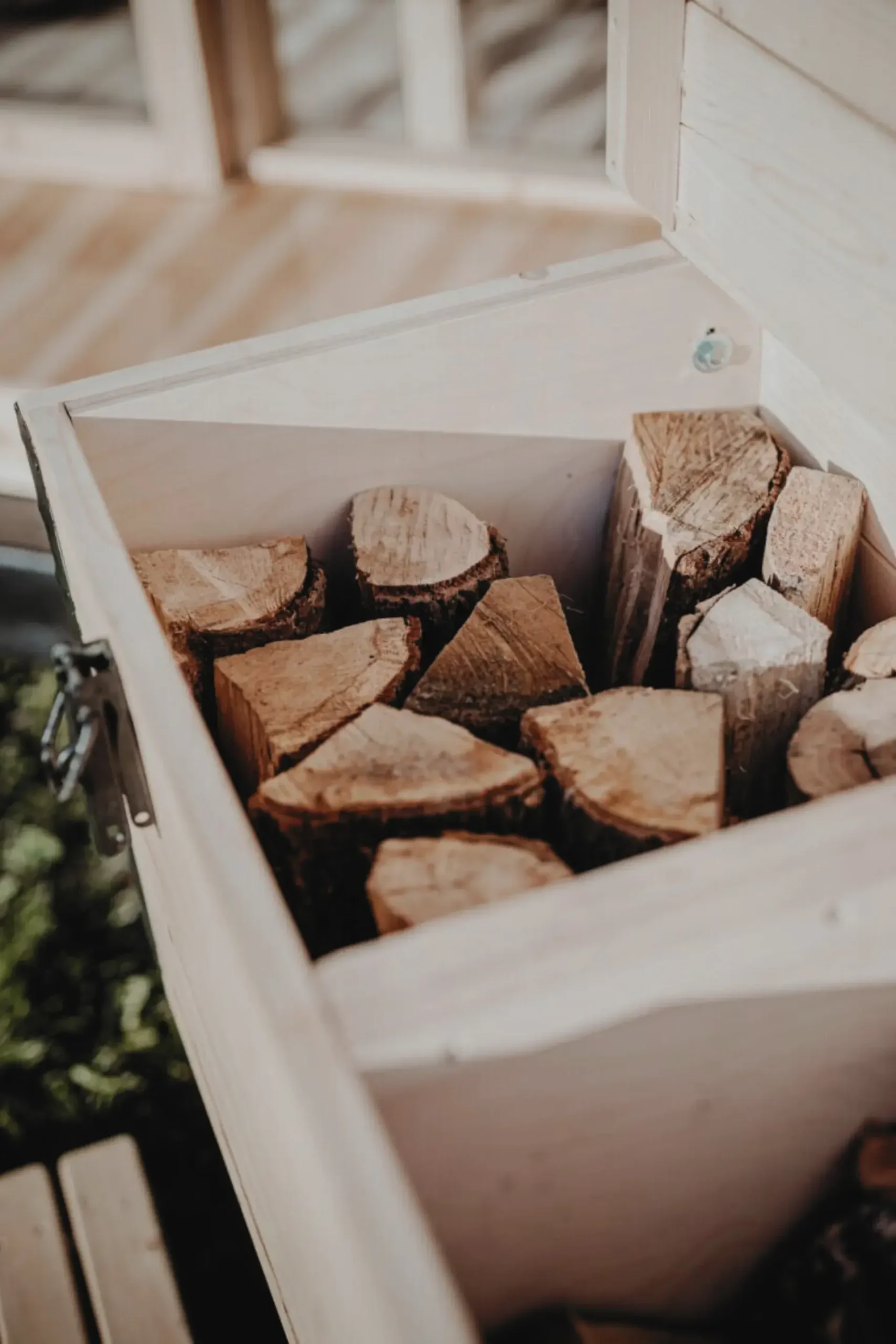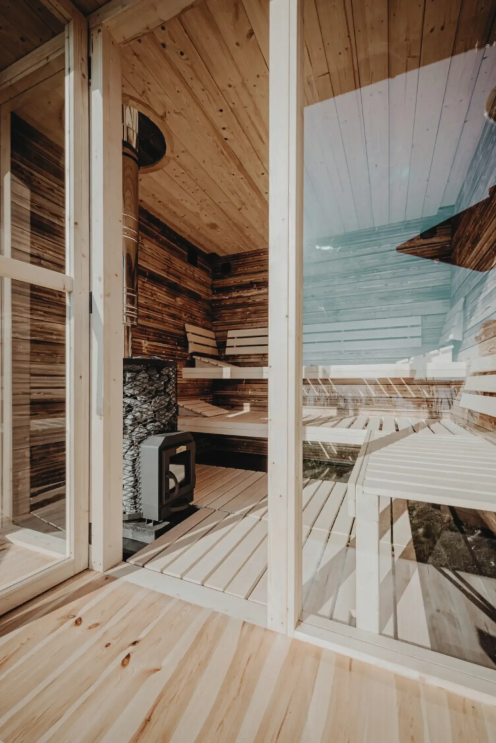 Die Sauna ist mit transparenten Lacken der Firma Tikkurila imprägniert.
