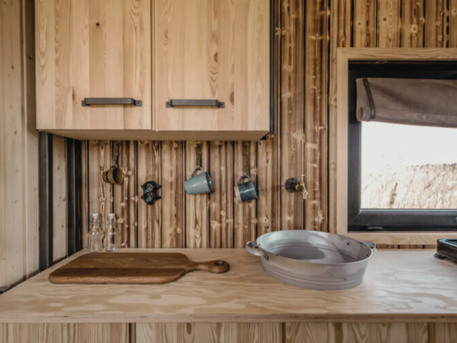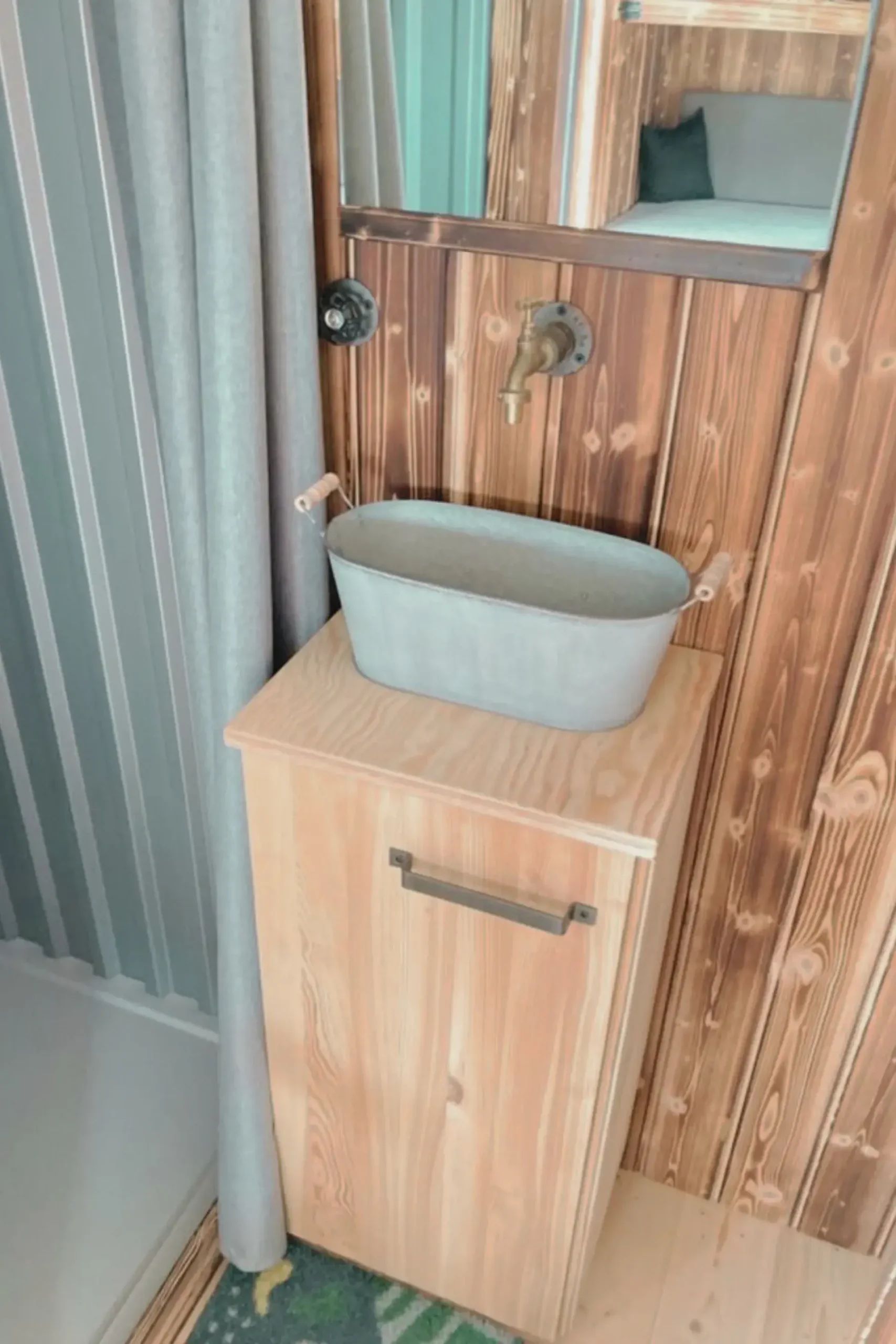 Ein Kühlschrank mit den Maßen 80 cm Höhe und 50 cm Breite passt in den Schrank hinter dem Vorhang. Ein weiterer möglicher Platz für einen kleineren Kühlschrank ist der Küchenschrank (der erste rechts, mit einer Steckdose).