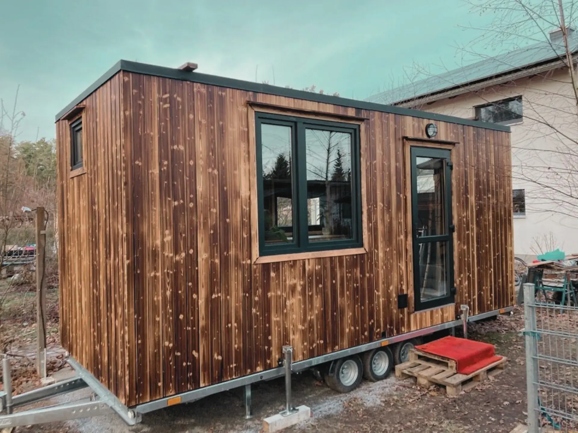 Geeignet zum Wohnen auf einem Anhänger oder auf einem vorbereiteten Grundstück.
