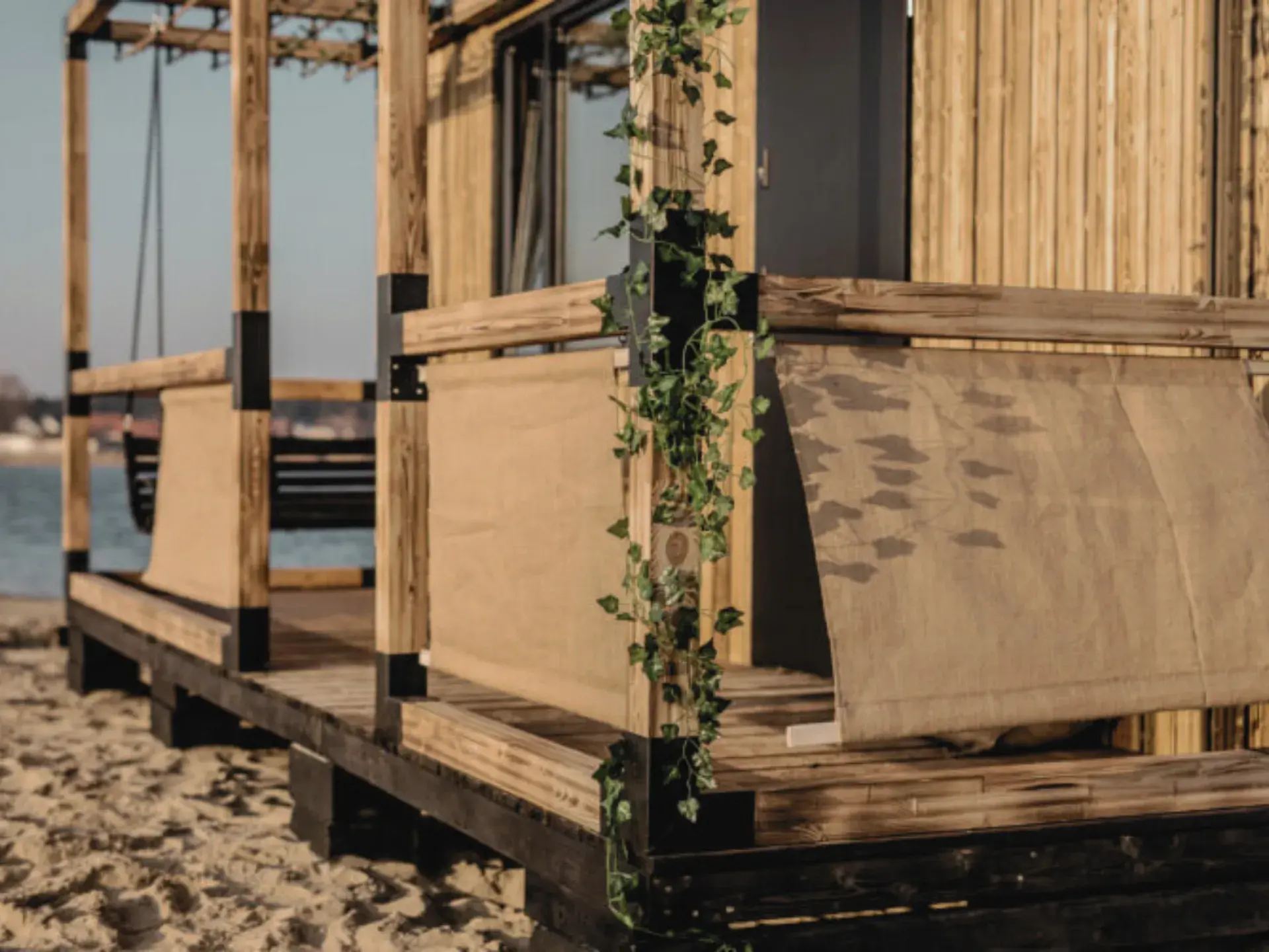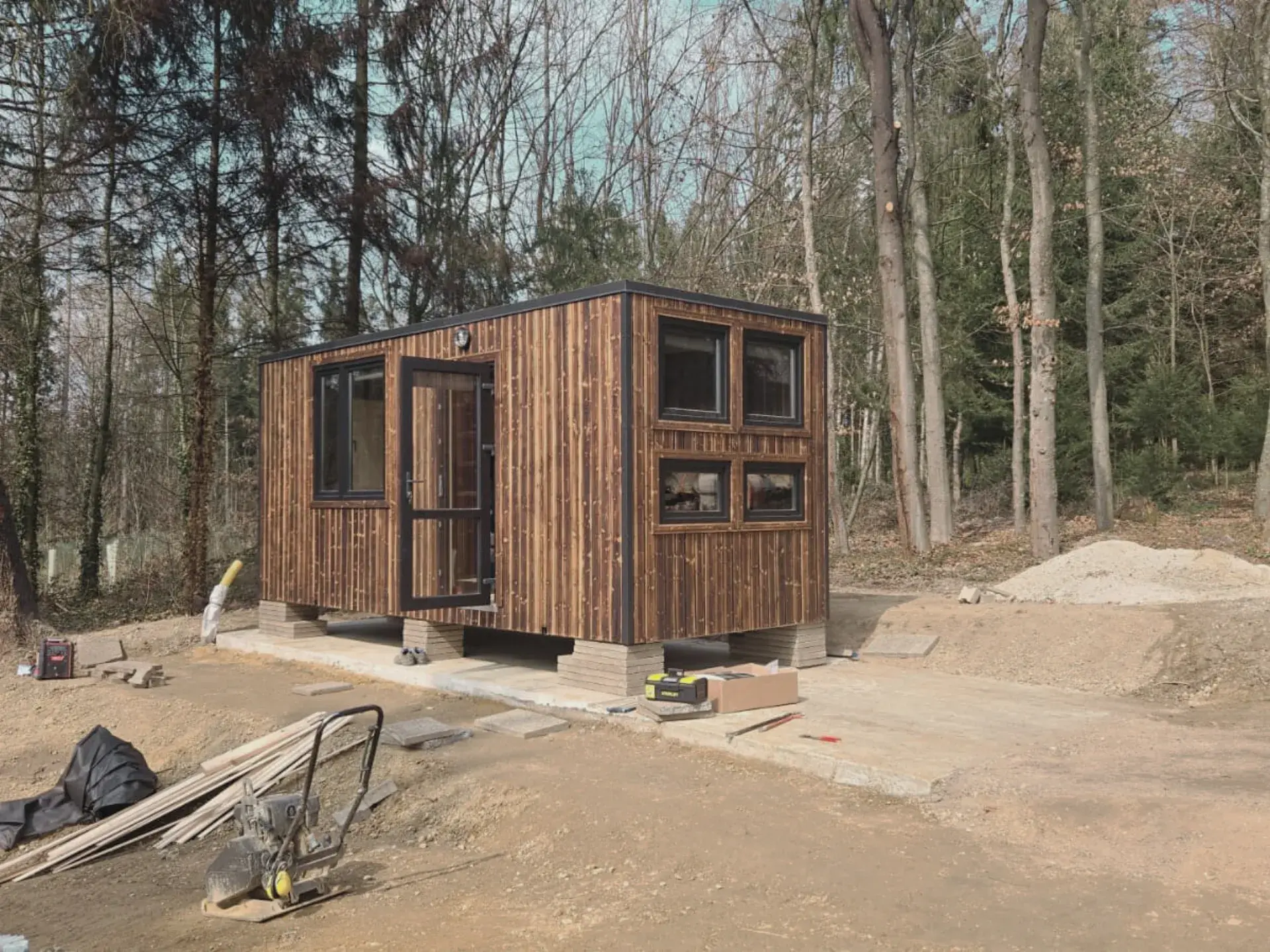 Zu 90% aus echtem Holz. Baugerüst aus Konstruktionsbalken C24 (95x45 mm). Boden aus Blech, OSB-Platten, Holzrahmen und Laminatplatten.