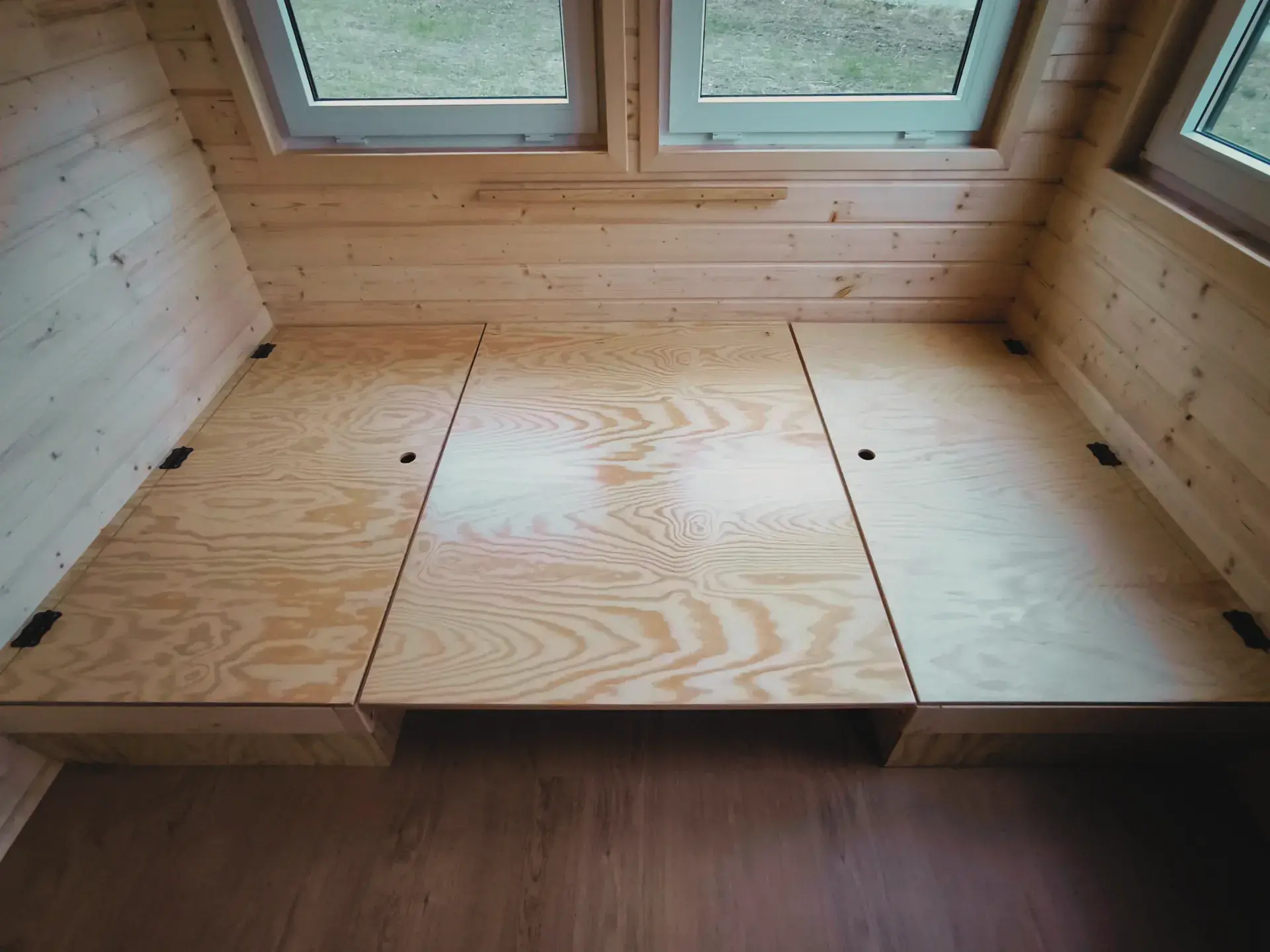 Zu 90% aus echtem Holz. Baugerüst aus Konstruktionsbalken C24 (95x45 mm). Boden aus Blech, OSB-Platten, Holzrahmen und Laminatplatten.